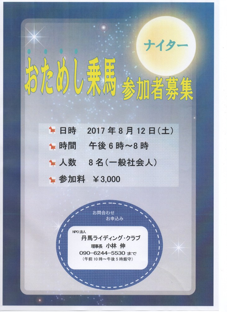 8/12 (土) 夏のおためしナイター乗馬会 18:30~ 定員8名 ¥3,000.-