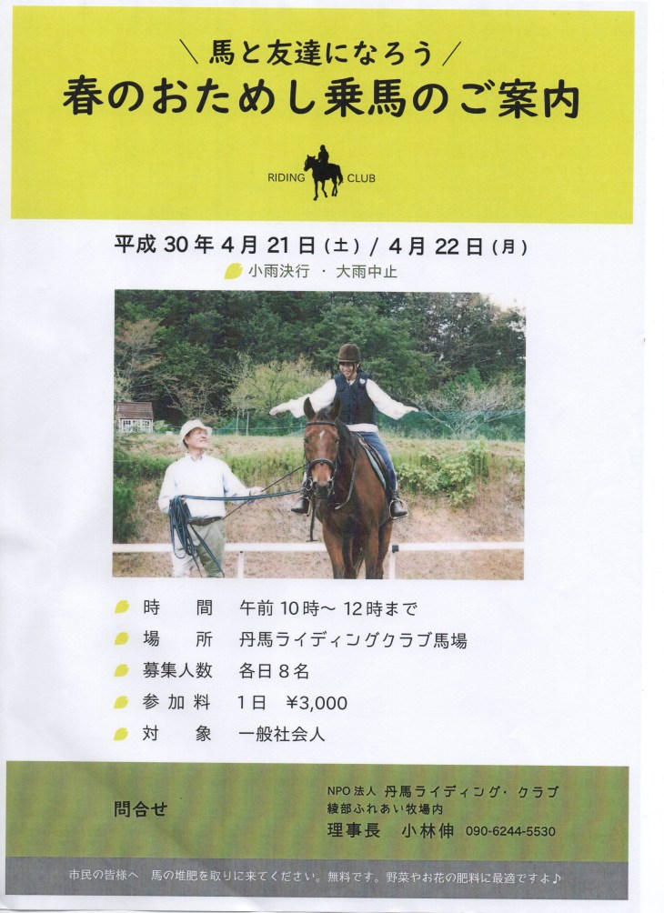 2018.3.28 春の綾部ふれあい祭『無料体験乗馬』のチラシが出来ました。